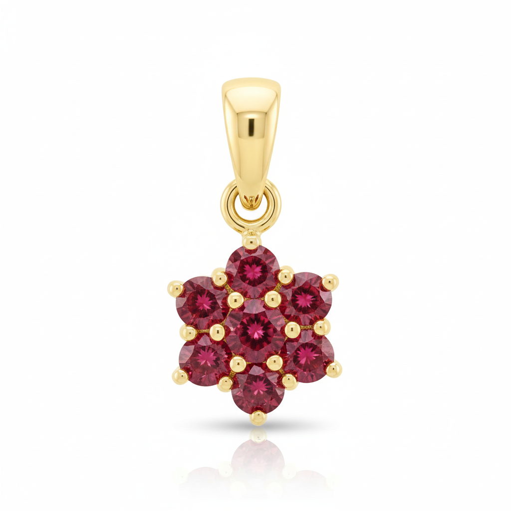 Dieser edle Anhänger aus 333er Gelbgold besticht durch seine klare Linienführung und die satte, tiefrote Farbe von sieben sorgfältig gefassten Granatsteinen. Das warme Funkeln der Edelsteine bildet einen ausdrucksstarken Kontrast zum strahlenden Goldglanz.