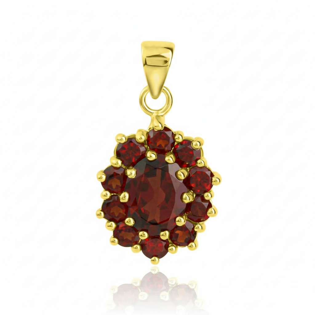 Dieser edle Anhänger aus vergoldetem Sterling Silber wird durch seine elf funkelnden Granatsteine zu einem echten Blickfang. Der große Mittelstein wird von zehn kleineren Granaten umrahmt – eine harmonische Komposition, die Tiefe und Strahlkraft perfekt vereint.