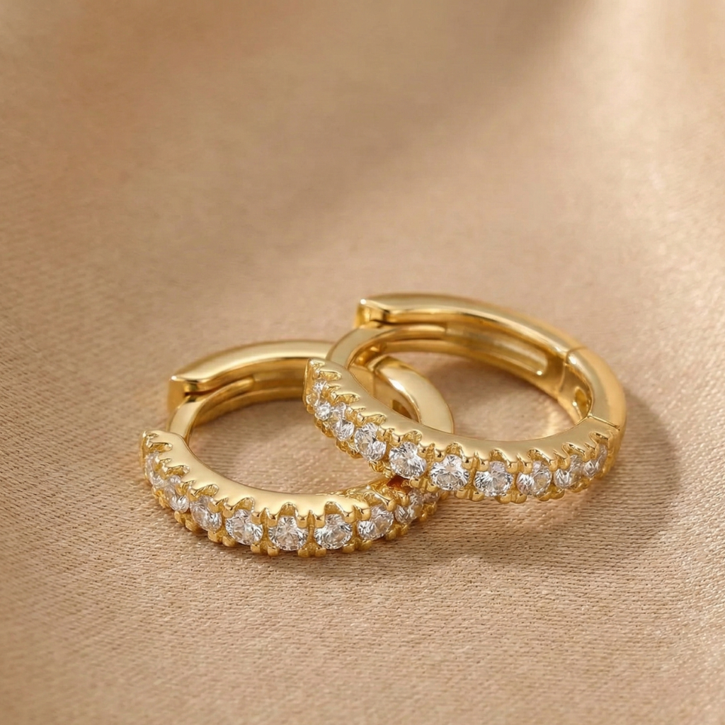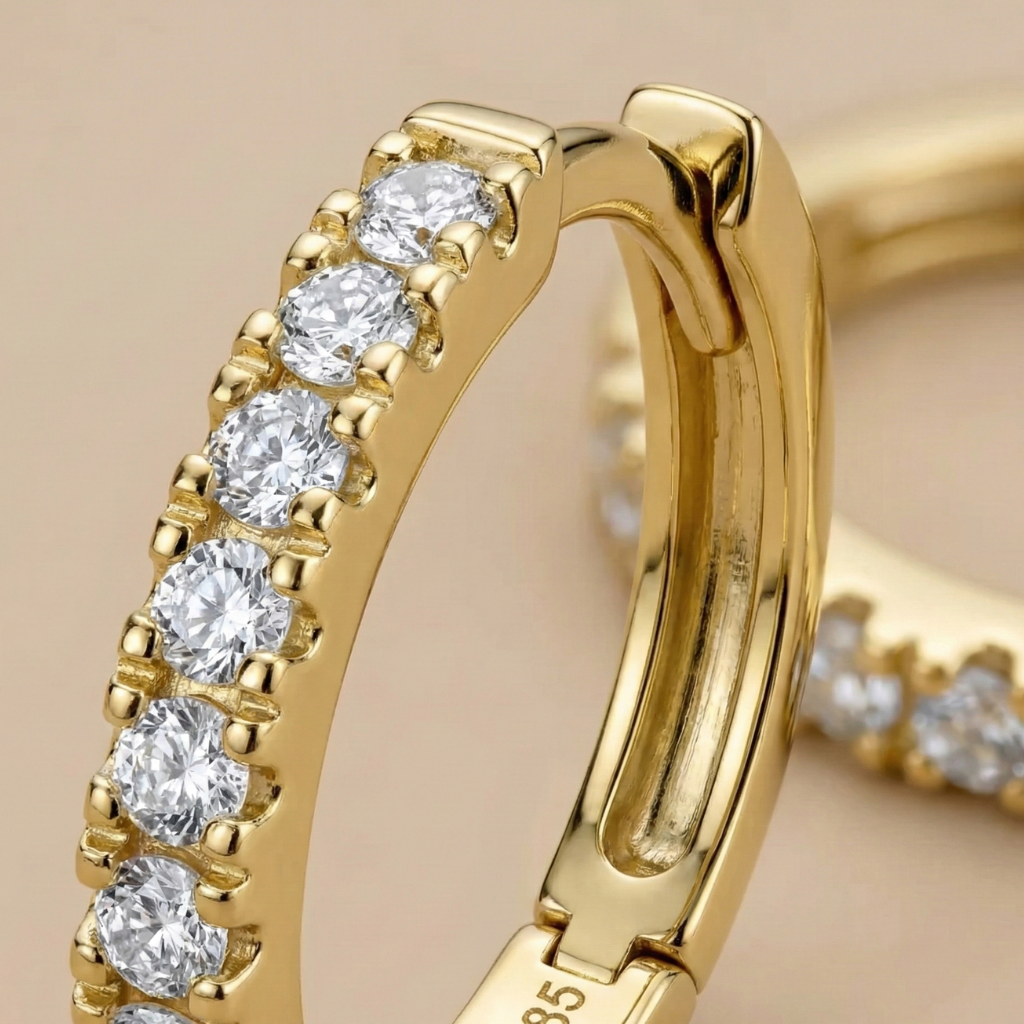 Diese feinen Klappcreolen aus hochwertigem 585er Gold bestechen durch ihre klare Form und den eleganten Glanz. Die dezent eingefassten Zirkonia sorgen für ein stilvolles Funkeln – genau richtig für Frauen, die schlichte Eleganz mit einem Hauch Luxus lieben.