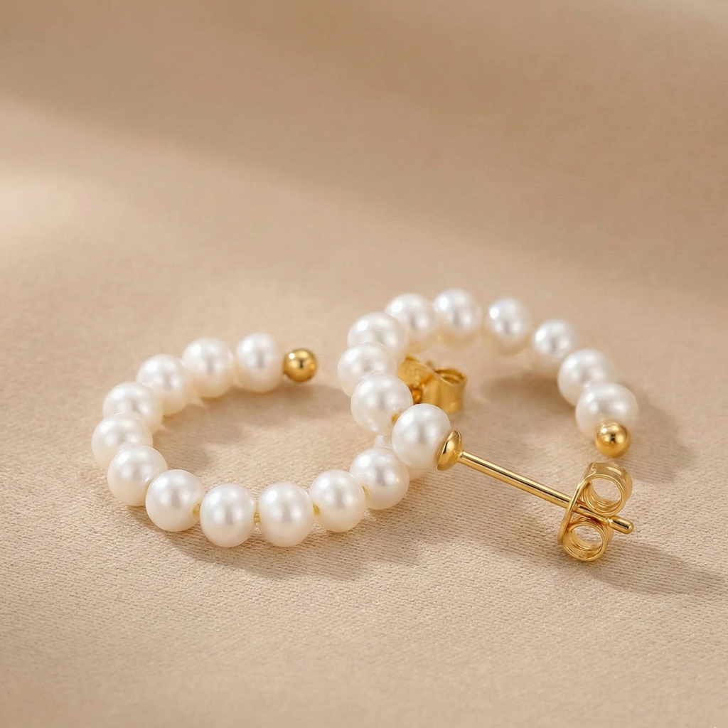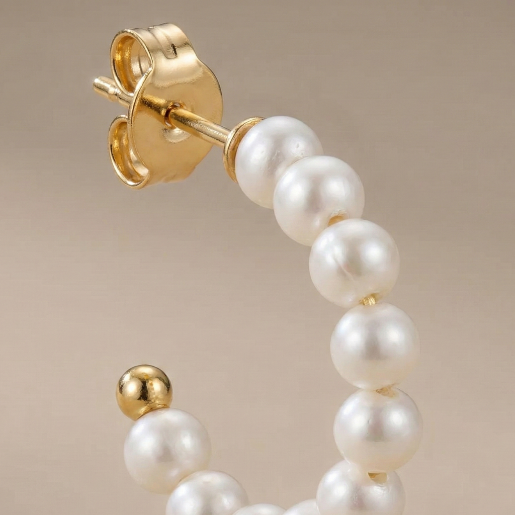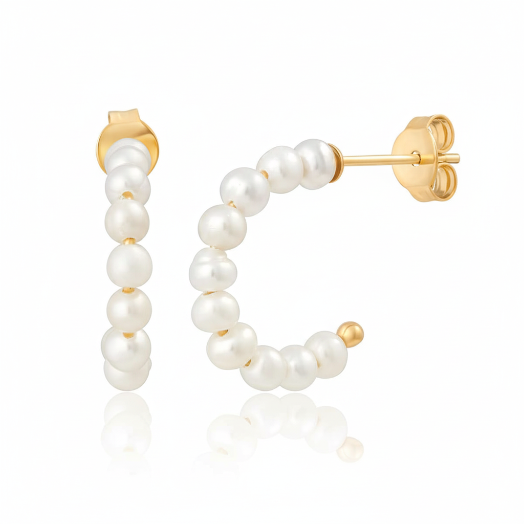 Diese Creolen kombinieren den klassischen Charme von strahlend weißen Perlen mit der warmen Eleganz von vergoldetem 925/- Sterling Silber. Jede Creole ist mit insgesamt 20 edlen Perlen besetzt, die sich zu einer harmonischen Rundung formen und dem Design eine moderne Leichtigkeit verleihen. Mit ihrem zeitlosen Stil sind sie sowohl für den Alltag als auch für festliche Anlässe ein perfekter Begleiter. Ein Schmuckstück, das feminine Raffinesse und pure Eleganz ausstrahlt.