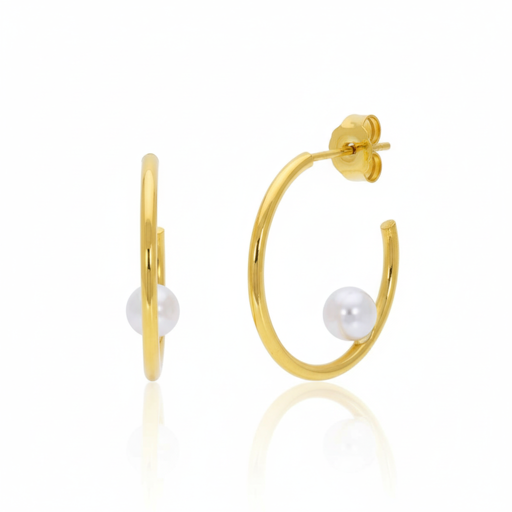 Diese Ohrringe verbinden das zeitlose Design von Creolen mit der klassischen Eleganz weißer Süßwasserzuchtperlen. Die Kombination aus glänzend vergoldetem Silber und der schimmernden Perle macht sie zu einem femininen Accessoire, das Ihrem Look eine edle Note verleiht. Perfekt für den Alltag oder um ein festliches Outfit zu unterstreichen.