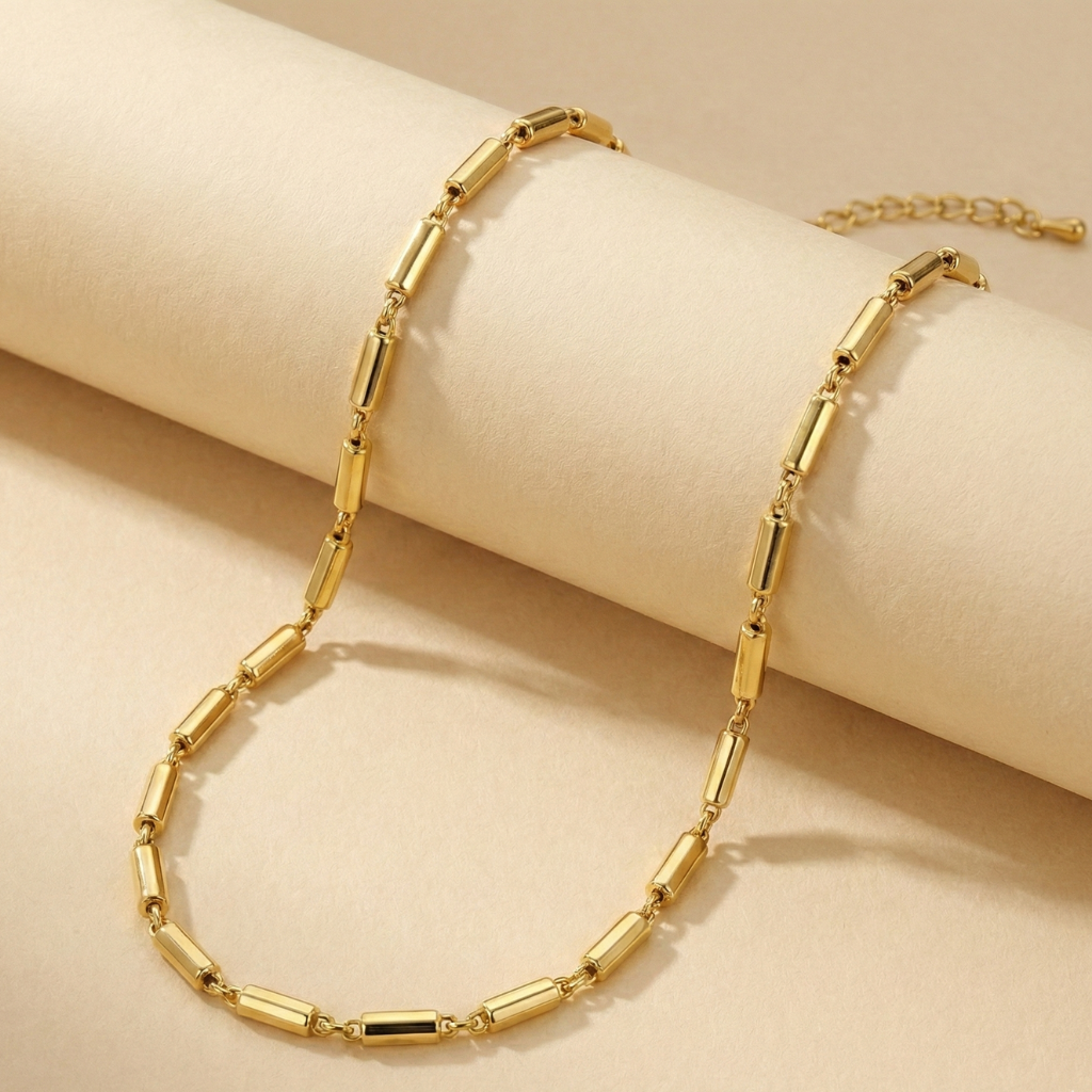 Diese elegante Fantasiekette besticht durch ihr glänzendes vergoldetes Finish und die feine Verarbeitung. Mit einer variablen Länge von 42 bis 47 cm lässt sie sich flexibel tragen und vielseitig kombinieren. Dank des robusten Karabinerverschlusses bietet sie sicheren Halt, während ihr stilvolles Design einen Hauch von Luxus in den Alltag oder zu besonderen Anlässen bringt.