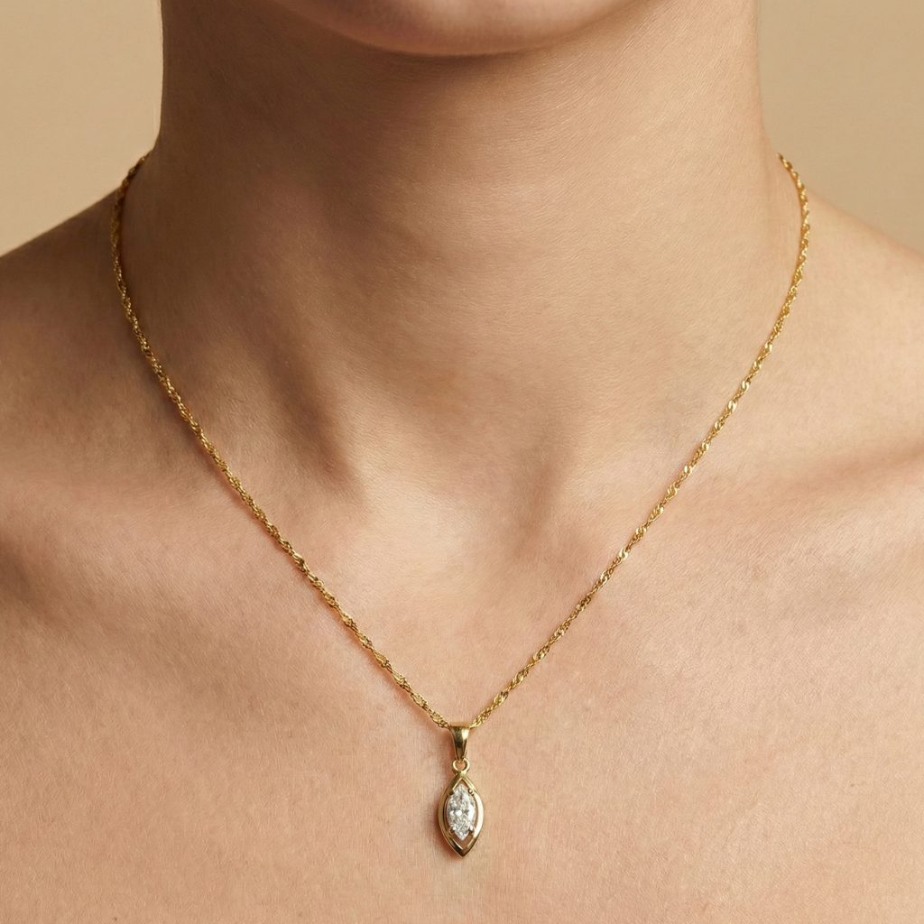 Dieser elegante Damenanhänger aus 333 Gold fasziniert mit einem strahlenden Zirkonia im edlen Navetteschliff. Der weiße Stein wird von einer feinen Krappenfassung gehalten, die sein Funkeln besonders schön zur Geltung bringt. Zusammen mit der filigranen Singapurkette entsteht ein klassisches Schmuckstück, das jedes Outfit mit einem Hauch von Luxus veredelt.