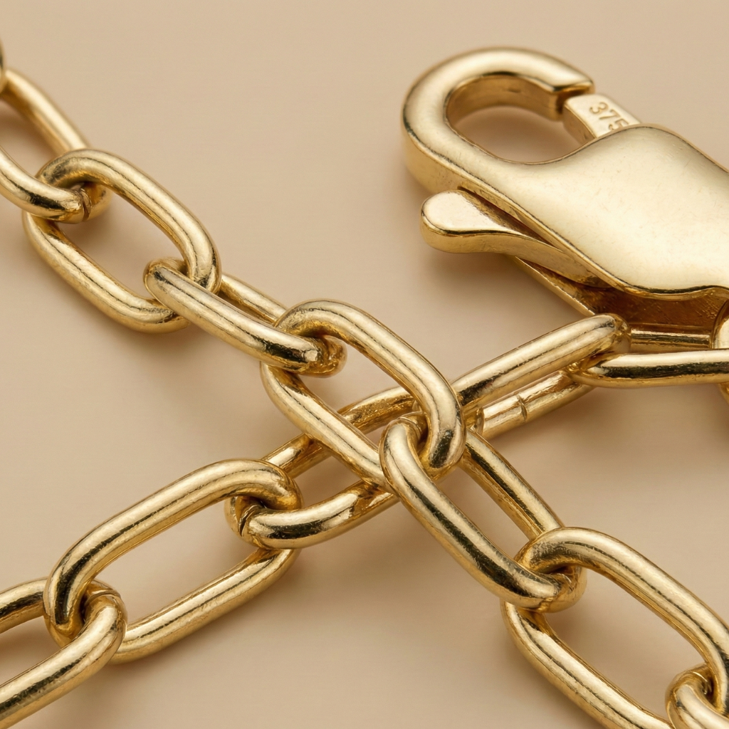 Diese stilvolle Gliederkette aus 375er Gelbgold begeistert mit ihrer zeitlosen Eleganz und einem modernen, offenen Kettenglied-Design. Die oval geformten Glieder verleihen der Kette eine filigrane, aber zugleich charakterstarke Optik.