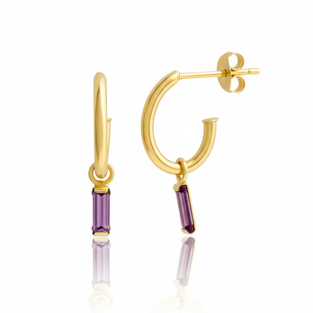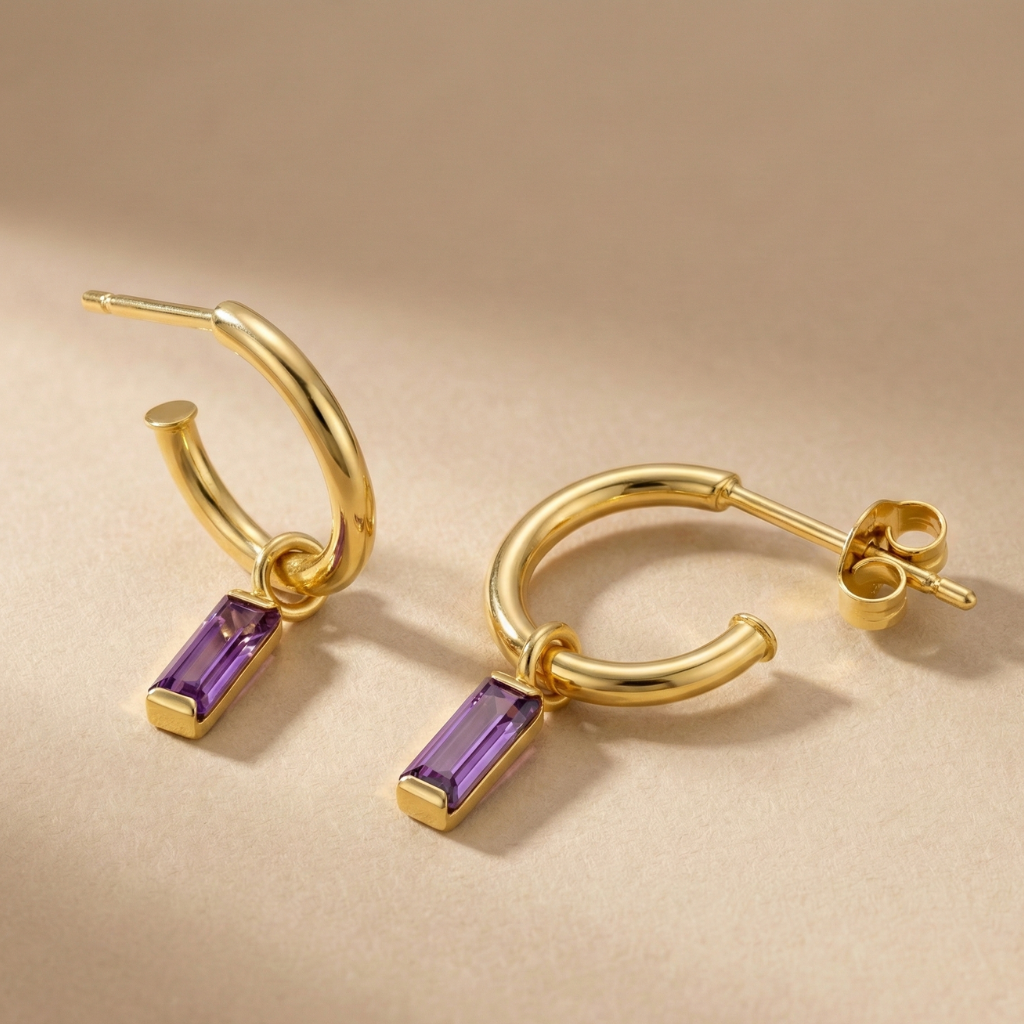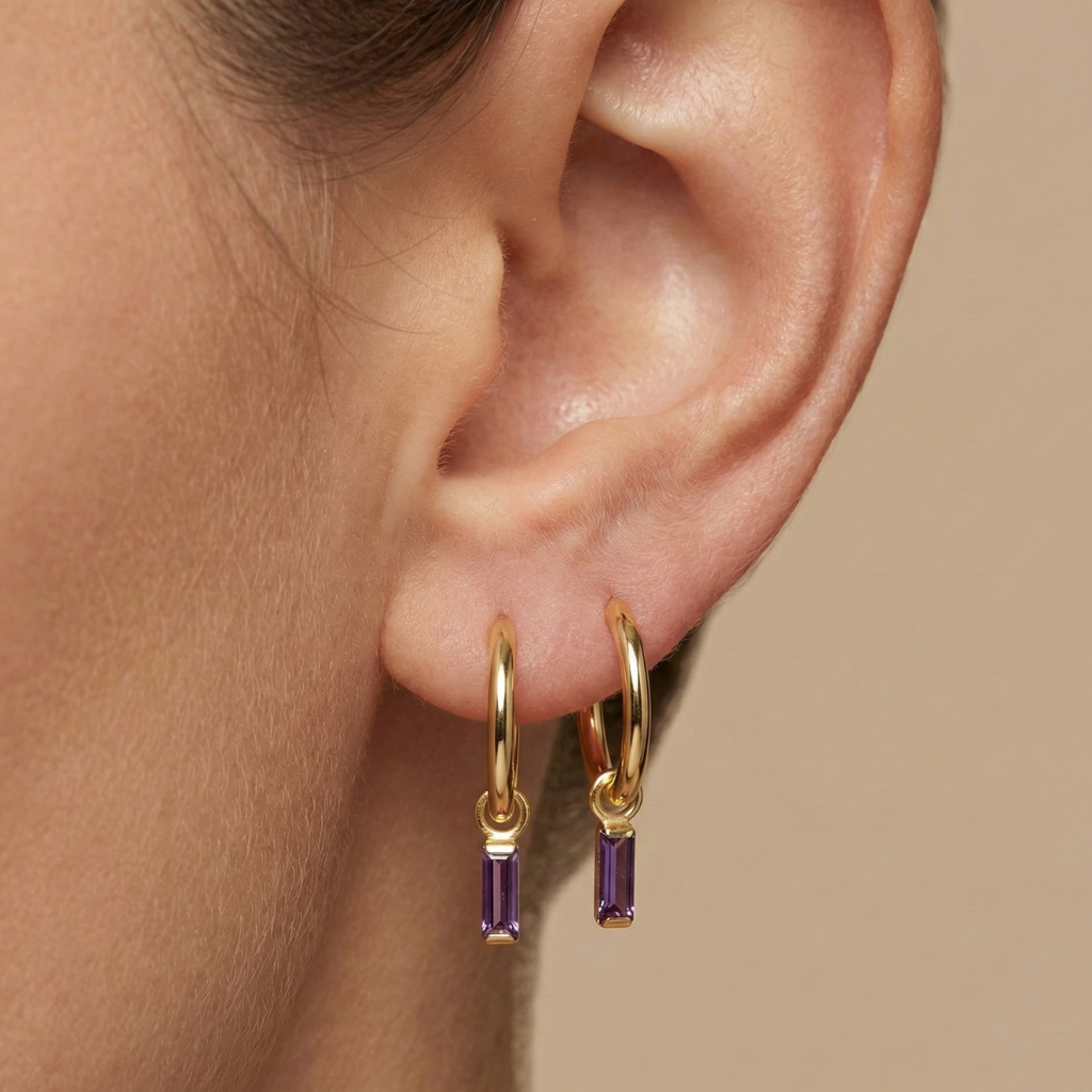 Diese Ohrhänger verbinden zarte Eleganz mit einem Hauch von Farbe und setzen durch den lila Zirkonia im Baguetteschliff stilvolle Akzente. Das glänzende 333 Gold sorgt für einen warmen Rahmen und macht diese Schmuckstücke zum perfekten Begleiter für besondere Anlässe wie auch für den Alltag.