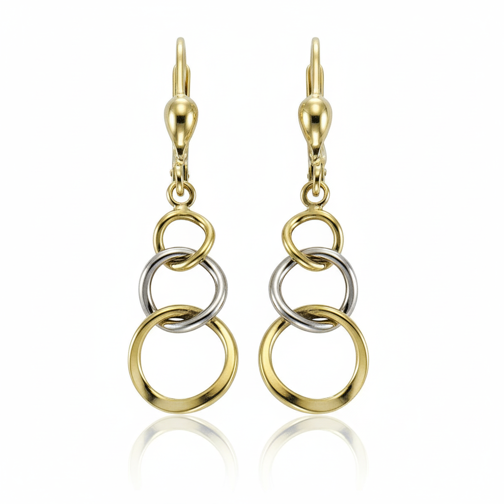 Diese Ohrhänger aus 375/- Gold bestehen aus ineinander verschlungenen, glänzenden Ringen in Bicolor-Optik. Das schwungvolle Design wirkt modern und gleichzeitig elegant – ideal für Frauen, die Wert auf einen stilvollen und besonderen Look legen.