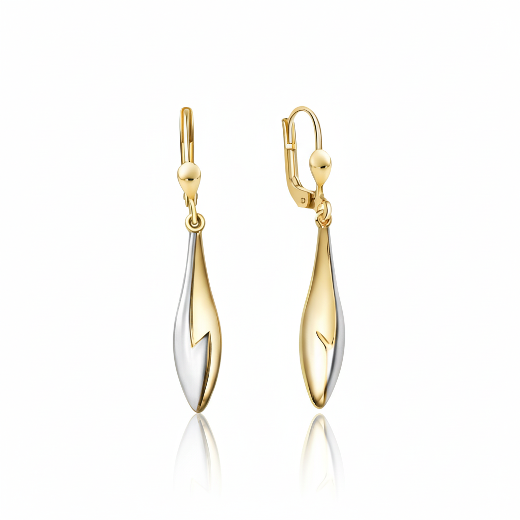 Diese eleganten Ohrhänger aus hochwertigem 375/- Gold zeichnen sich durch ihr modernes Bicolor-Design mit teils rhodinierter Oberfläche aus. Die harmonische Tropfenform mit fließenden Linien sorgt für eine edle, feminine Wirkung und macht die Ohrringe zu einem vielseitigen Schmuckstück für jeden Anlass. Durch den praktischen Klappverschluss sitzen sie sicher und angenehm am Ohr.