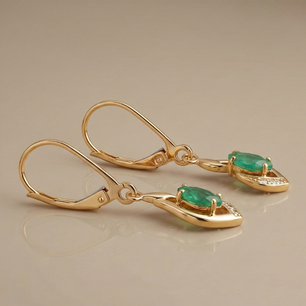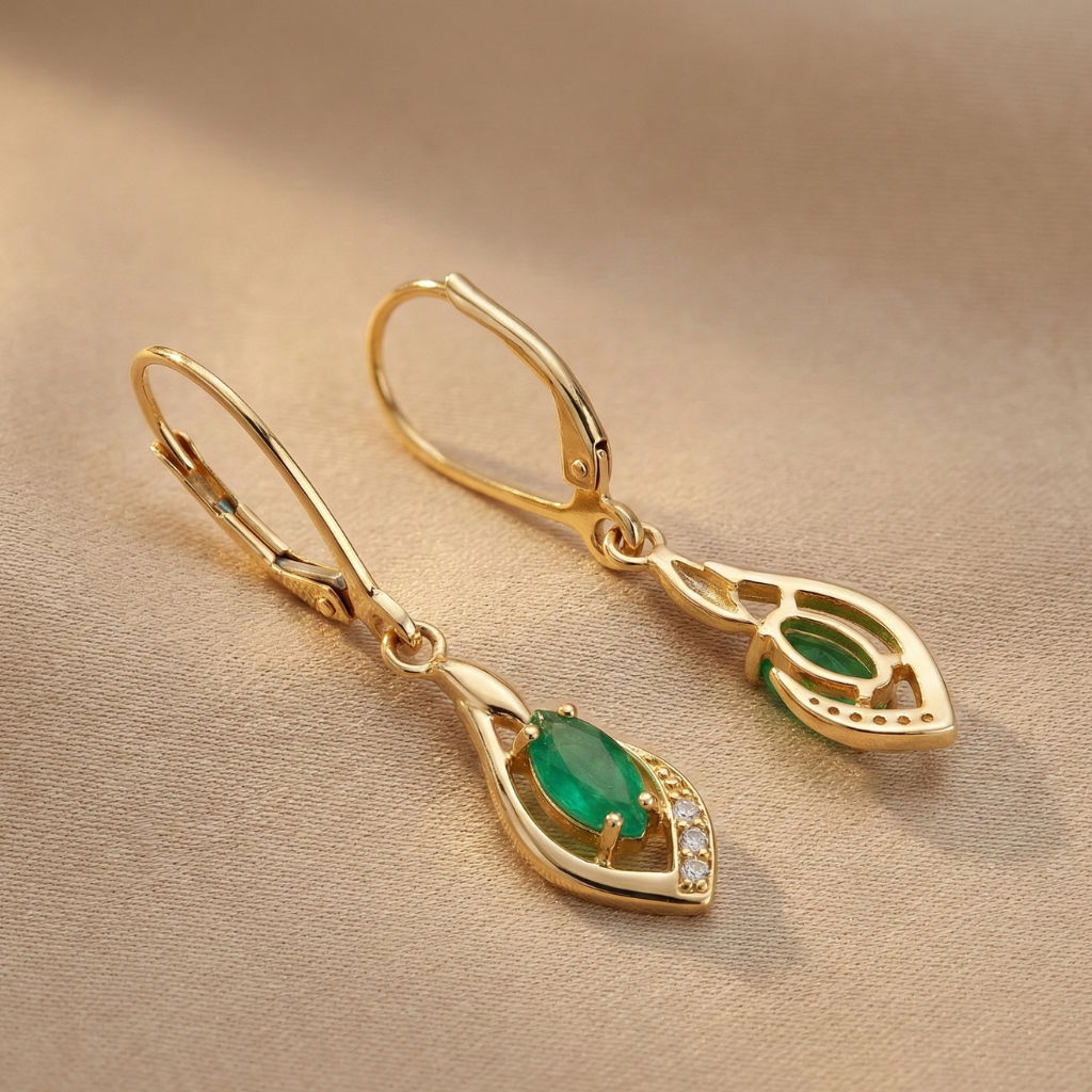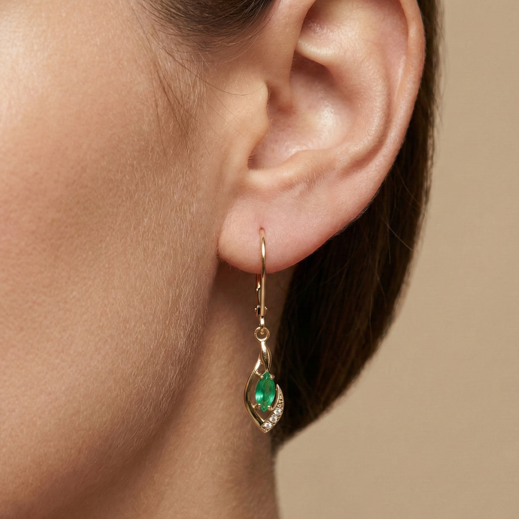 Diese stilvollen Ohrhänger aus 375er Gelbgold vereinen feinste Handwerkskunst mit natürlicher Farbpracht. Im Zentrum steht der grüne Smaragd im eleganten Tropfenschliff (6 × 3 mm), der für Vitalität, Harmonie und zeitlose Schönheit steht. Der funkelnde Weißtopas bringt Leichtigkeit ins Design und sorgt für eine edle Lichtreflexion.