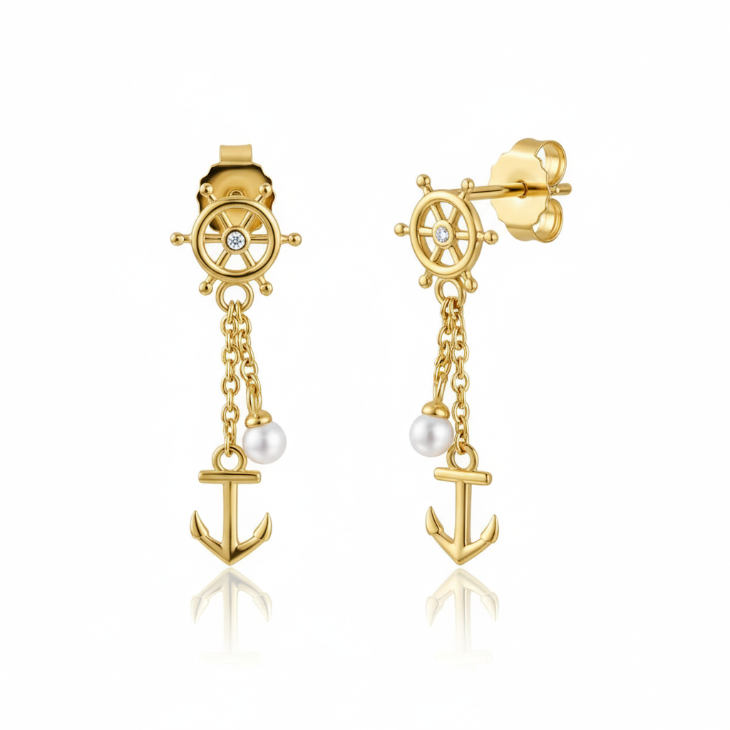 Diese stilvollen Ohrhänger vereinen maritimen Charme mit zeitloser Eleganz. Das Design mit Steuerrad und Anker wird durch funkelnde Zirkonia und kleine Perlendetails ergänzt. Vergoldetes Sterling Silber sorgt für einen warmen Glanz und macht die Ohrringe zu einem echten Highlight. Perfekt, um deinem Look eine frische, maritime Note zu verleihen – ob im Alltag oder zu besonderen Anlässen.