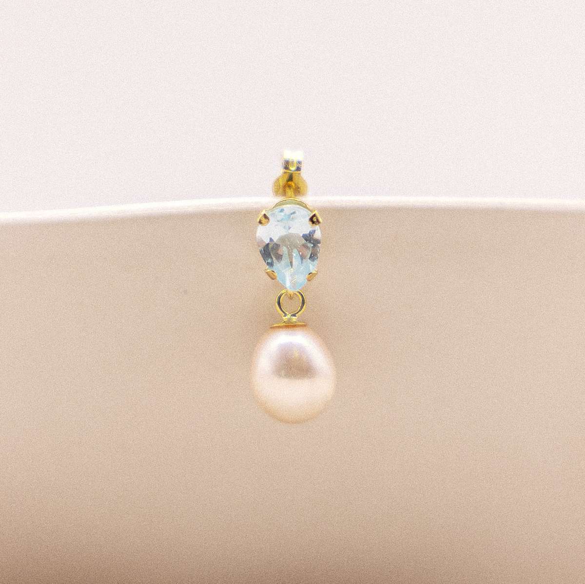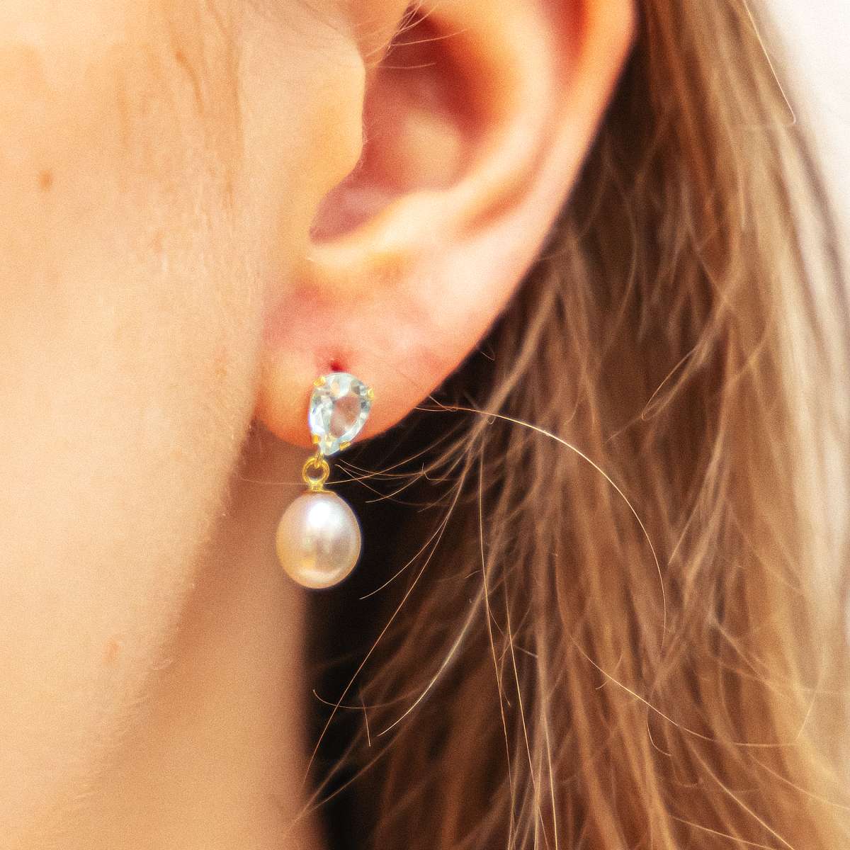 Diese stilvollen Ohrhänger kombinieren die klare Eleganz von himmelblauem Blautopas mit der zeitlosen Schönheit von weißen Süßwasserperlen. Der Tropfen-Schliff des Blautopas in funkelnder Krappenfassung zieht die Blicke auf sich, während die schimmernde Perle einen femininen und edlen Akzent setzt. Gefertigt aus glänzendem 333er Gelbgold und ausgestattet mit einem sicheren Stecker-Verschluss, sind diese Ohrringe ein exquisites Schmuckstück für besondere Anlässe.