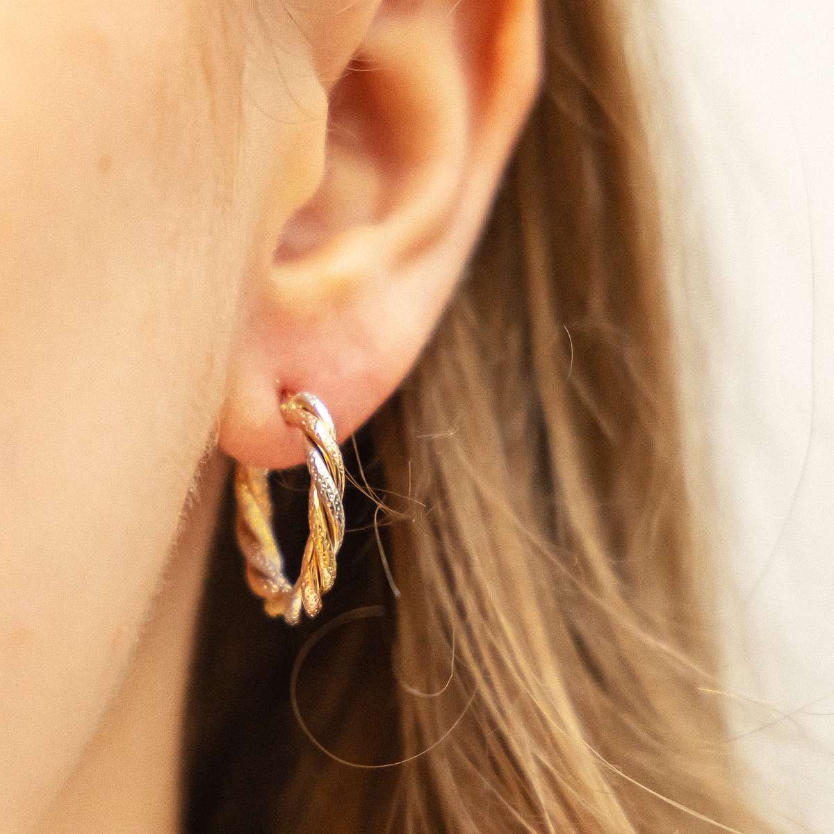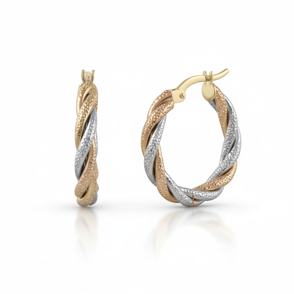 Diese kunstvoll gearbeiteten Creolen vereinen edles Gelb-, Weiß- und Rotgold in einer raffinierten Flechtoptik. Die teils vergoldete Oberfläche mit feiner Strukturierung verleiht den Ohrringen ein lebendiges Funkeln und eine besondere Tiefe. Dank der hochwertigen 585/- Goldlegierung und des sicheren Klappverschlusses sind sie sowohl im Alltag als auch zu festlichen Anlässen ein luxuriöser Begleiter.