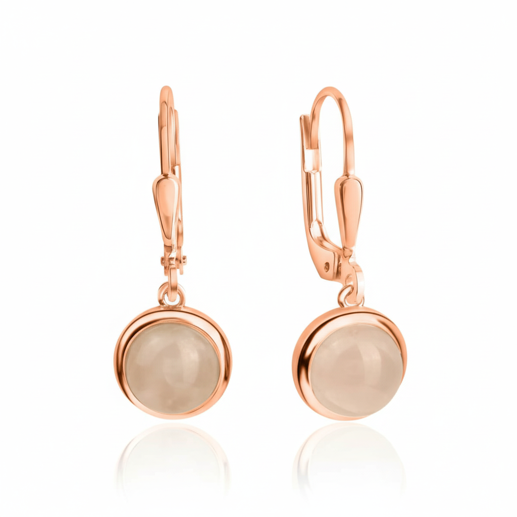 Diese eleganten Ohrhänger vereinen zeitlose Eleganz mit modernem Design. Die zarten Rosenquarze im Cabochon-Schliff schimmern sanft in einem warmen Rosaton und sind in einer edlen Zargenfassung gehalten. Das rotvergoldete Sterling Silber sorgt für einen harmonischen Kontrast und unterstreicht die feminine Ausstrahlung. Mit sicherem Klappverschluss und hochwertiger Verarbeitung sind diese Ohrringe ein idealer Begleiter für Alltag und besondere Anlässe.