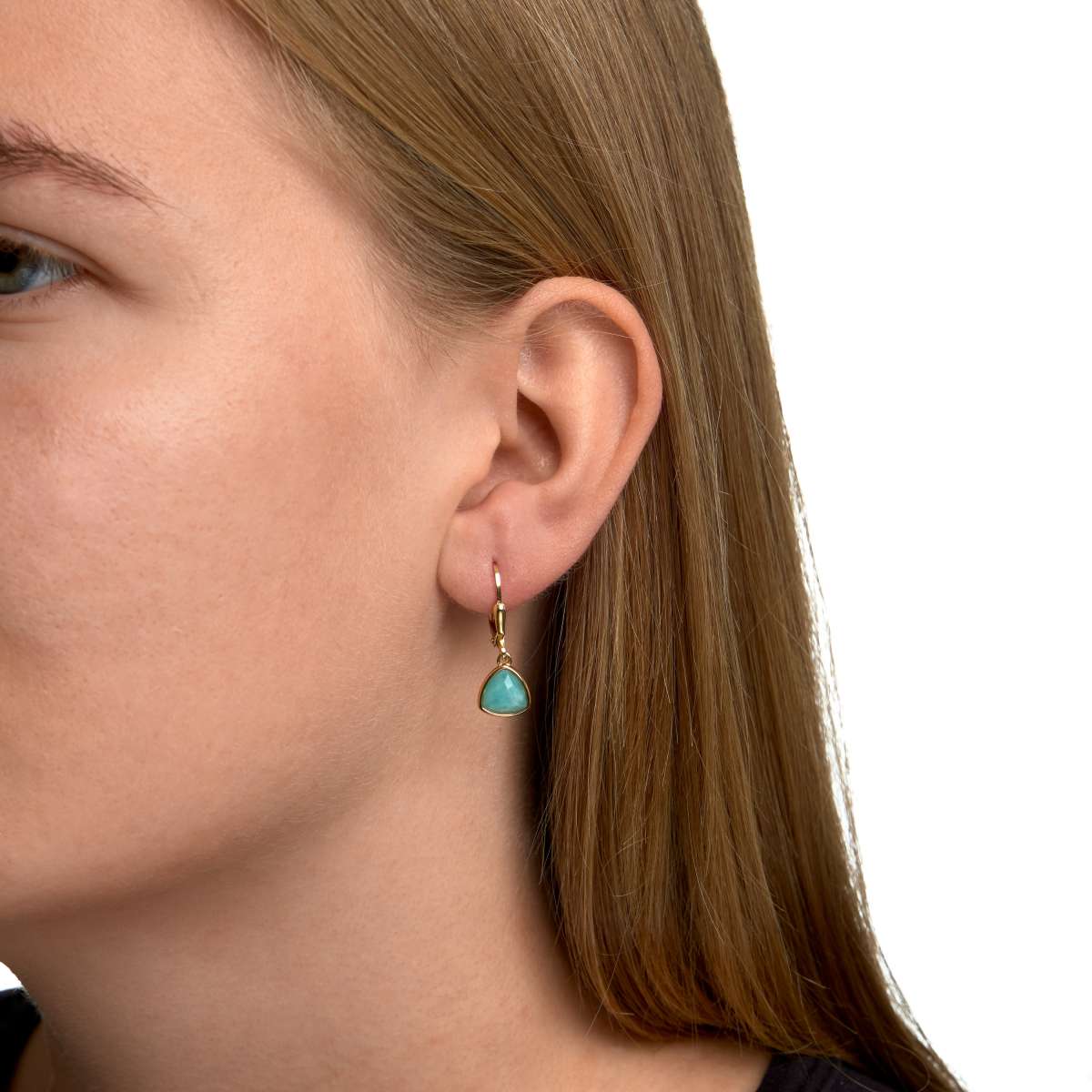 Diese Ohrhänger vereinen warm vergoldetes Sterling Silber mit dem sanften Schimmer des blauen Amazonits und strahlen zeitlose Eleganz aus. Durch den kunstvollen Navetteschliff kommt die besondere Farbintensität des Steins perfekt zur Geltung, während der sichere Klappverschluss einen komfortablen Halt bietet. Ein femininer Blickfang, der jedes Outfit geschmackvoll ergänzt.