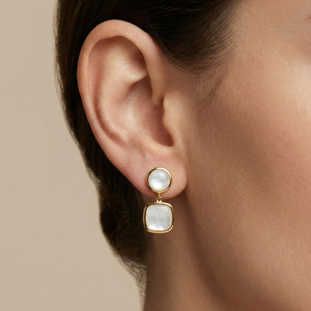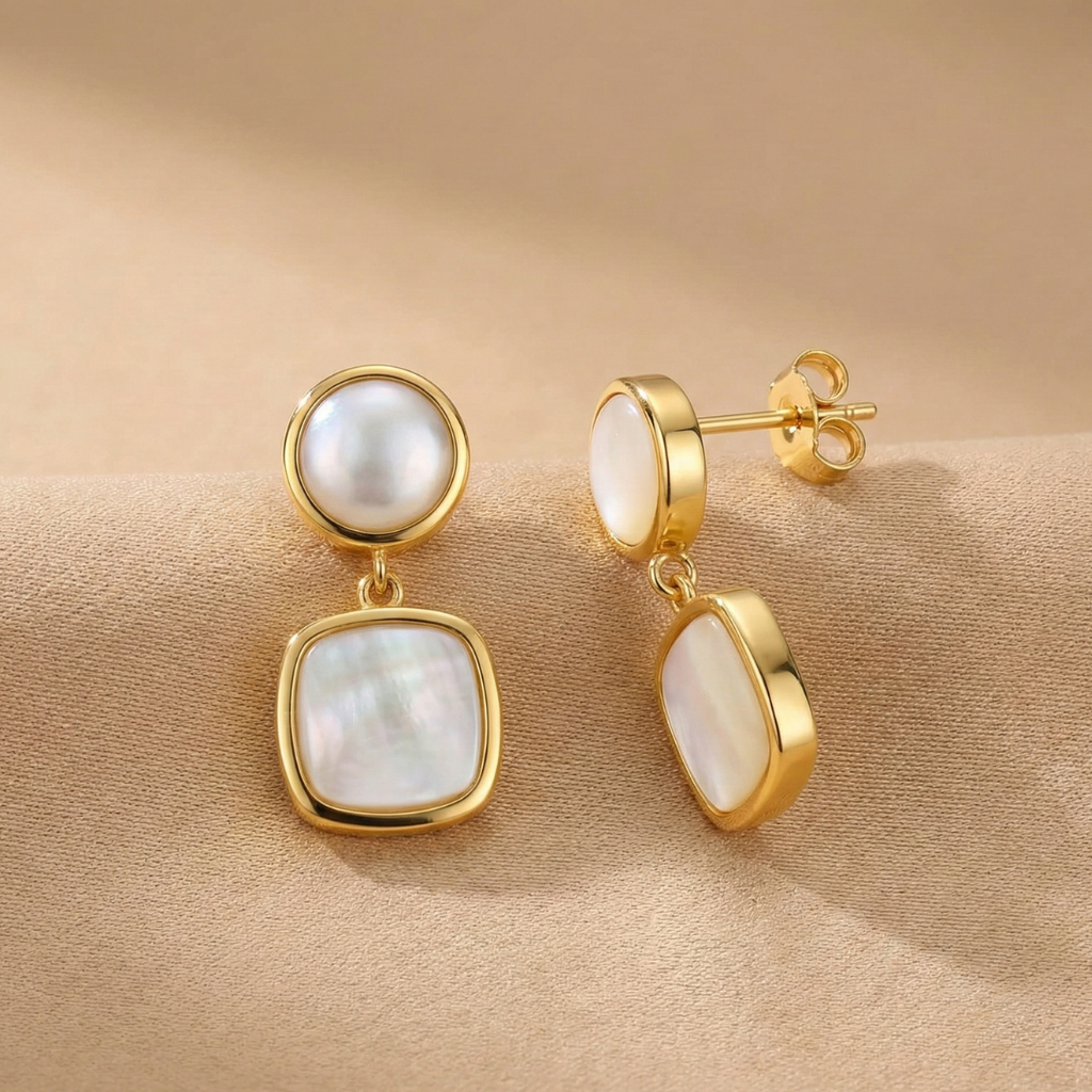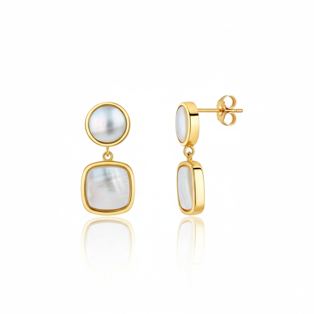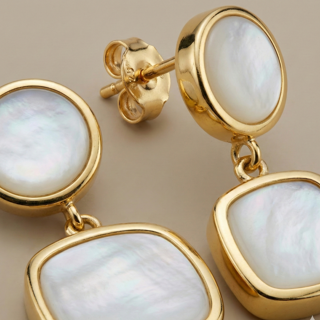 Diese eleganten Damen-Ohrringe vereinen modernes Design mit klassischer Eleganz. Gefertigt aus hochwertigem 925/- Sterling Silber und mit einer warmen Vergoldung veredelt, strahlen sie in zeitloser Schönheit. Der weiße Perlmutt-Einsatz fasziniert durch seinen sanften Schimmer und verleiht den Ohrsteckern einen edlen, leicht schillernden Effekt. Durch die Kombination aus runder und quadratischer Form wirken die Ohrringe zugleich stilvoll und modern.