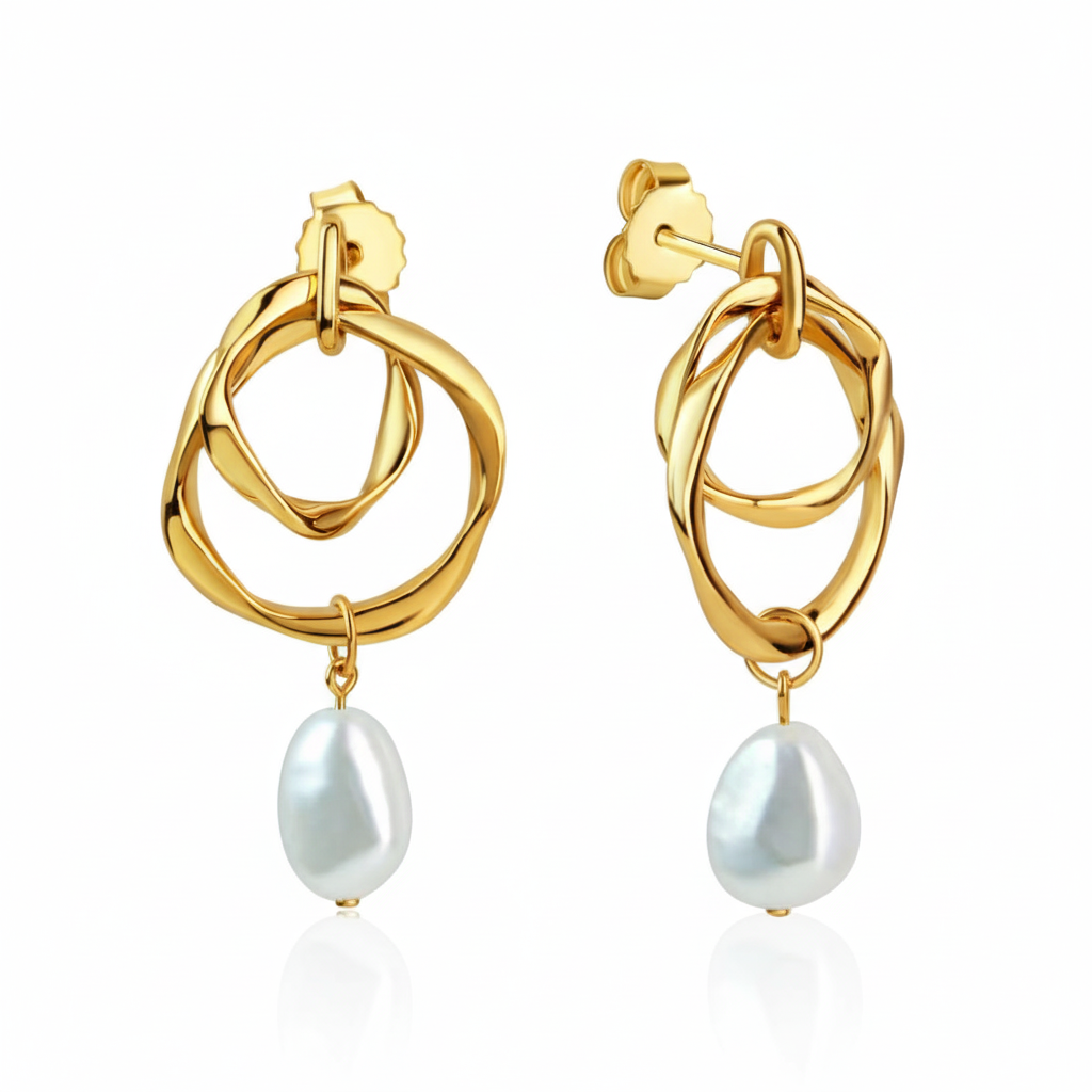 Diese außergewöhnlichen Ohrstecker kombinieren organisch geschwungene, vergoldete Elemente mit edlen weißen Süßwasserzuchtperlen. Das Zusammenspiel aus modernem Design und klassischer Perlen-Eleganz macht die Ohrringe zu einem echten Hingucker.
