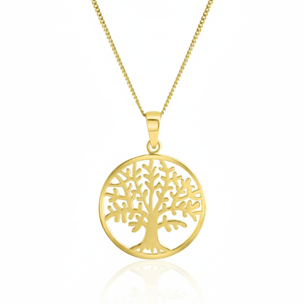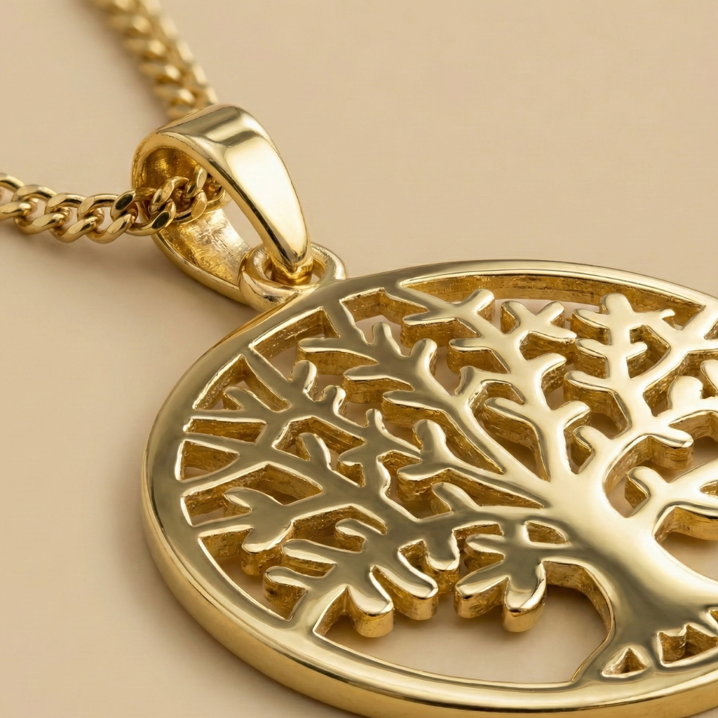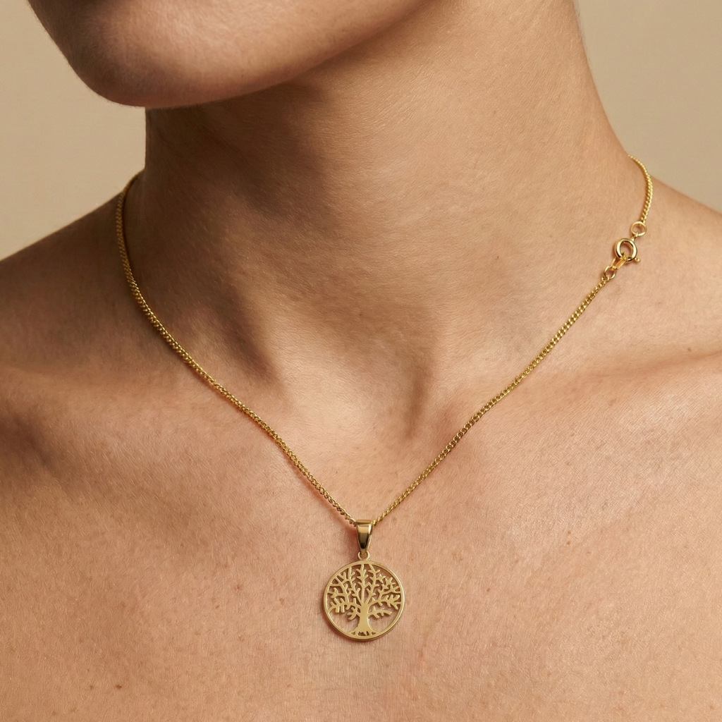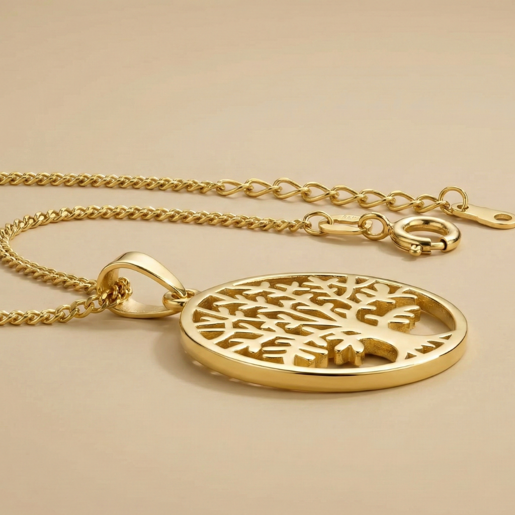 Diese edle Halskette besticht durch ihren runden Anhänger mit filigran gearbeitetem Lebensbaum-Symbol. Der Lebensbaum steht seit jeher für Stärke, Wachstum und Verbundenheit und macht die Kette zu einem besonderen Begleiter im Alltag wie auch zu festlichen Anlässen. Dank der hochwertigen Vergoldung strahlt das Schmuckstück in einem warmen Gelbgold-Ton und lässt sich wunderbar mit anderen Accessoires kombinieren.