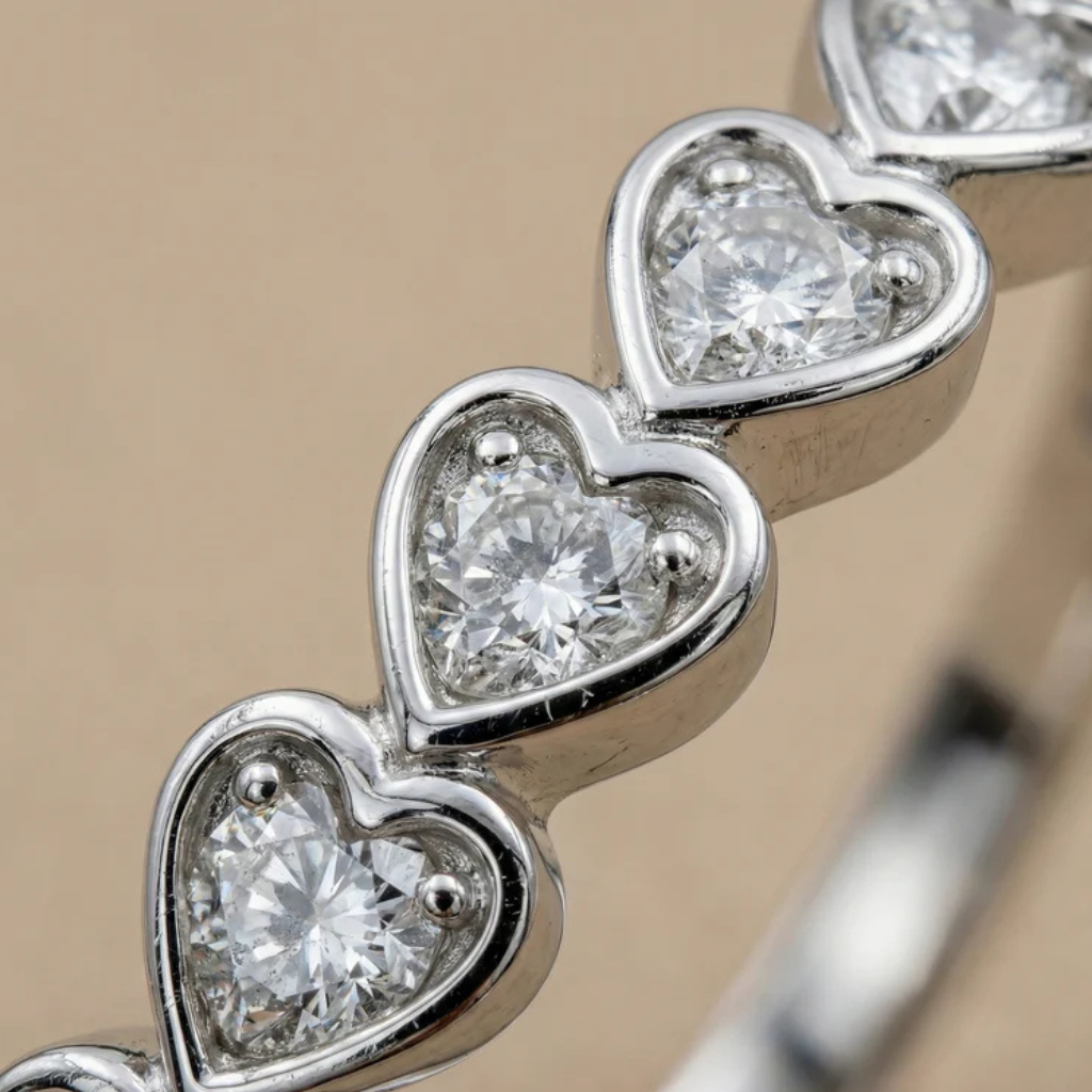 Dieser bezaubernde Damenring vereint romantisches Design mit hochwertiger Verarbeitung. Neun filigrane Herzformen, jeweils mit einem Brillanten besetzt, ziehen sich in feiner Linie über die Ringschiene. Durch das rhodinierte 375er Gold erhält der Ring einen modernen, eleganten Glanz, der die Brillanz der Diamanten besonders gut zur Geltung bringt.