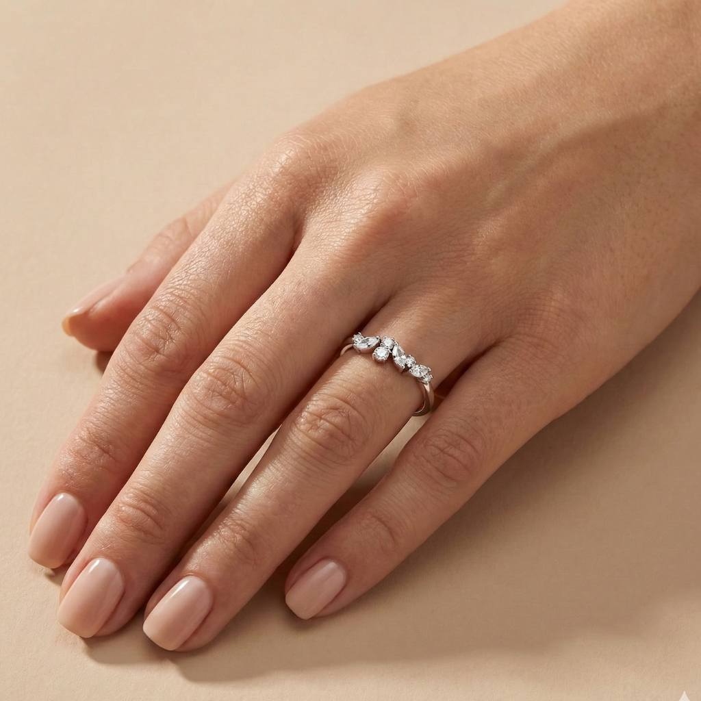 Dieser zauberhafte Damenring aus hochwertigem 375er Weißgold besticht durch seine filigrane Silhouette und das elegante Arrangement von acht funkelnden Zirkonia-Steinen in verschiedenen Schliffformen. Die feine, leicht geschwungene Linie der Steine verleiht dem Ring eine feminine, fließende Ästhetik – edel, aber dezent.
