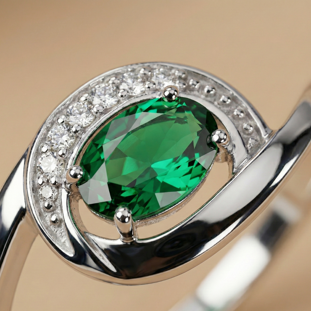 Dieser Damenring aus rhodiniertem 925er Sterling Silber setzt ein stilvolles Statement mit einem intensiv grünen synthetischen Smaragd im Mittelpunkt. Der Edelstein verleiht dem Ring einen Hauch von Luxus und Natürlichkeit – kombiniert mit der kühlen Eleganz des rhodinierten Silbers.