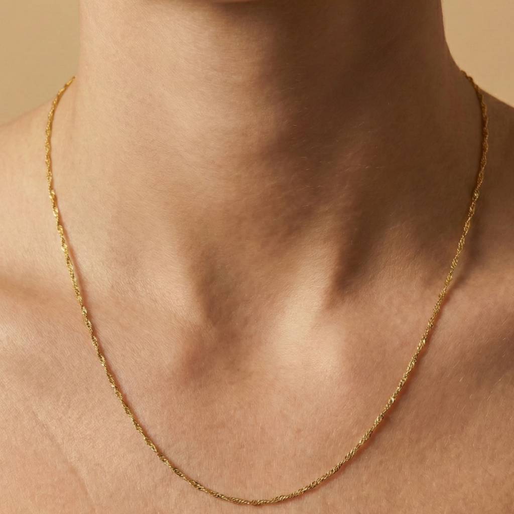 Diese edle Singapurkette aus 375/- Gelbgold besticht durch ihr filigranes, gedrehtes Design, das funkelnd das Licht einfängt. Mit 43 cm Länge liegt sie elegant am Hals und kann sowohl pur getragen als auch mit einem Anhänger kombiniert werden. Ihr klassischer Federringverschluss sorgt für sicheren Halt. Eine stilvolle Halskette, die vielseitig tragbar ist – von schlicht bis elegant.